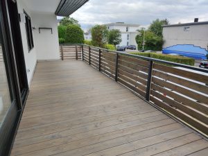 Bei einem Wohnhaus wurde die bestehende Betonplatten-Terrasse abgebrochen. Nach einer Überprüfung und Teilsanierung der Abdichtung durch unseren Dachdecker wurden die neuen Terrassendielen aus Glattkantbrettern, sibirischer Lärche mit 27mm Stärke auf eine Holzunterkonstruktion im Gefälle verlegt. Die Dielen wurden zweifach mit einer grau-silbernen Holzschutzlasur behandelt. Die Verschraubung der Dielen erfolgte mit Edelstahlschrauben. Durch die Querverlegung konnten durchgehende Dielen verwendet und Stoßpunkte vermieden werden.